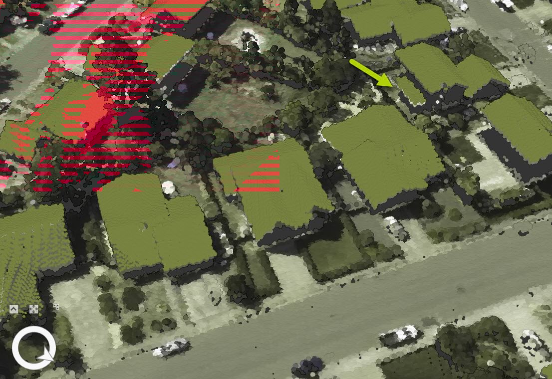 Below are some examples demonstrating the improved building roof classification results from ArcGIS Pro 2.4. The classified building points are displayed in red, while the background is rendered in RGB or in intensity.