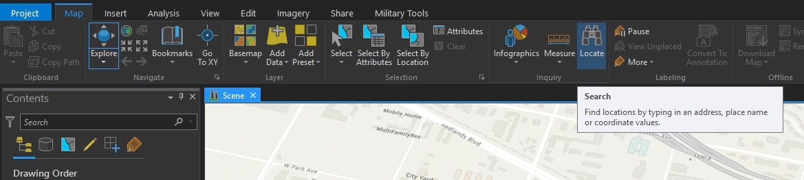 - We navigate to the area in which we will place your model. In this example, it is the ESRI campus in Redlands. To quickly navigate to the area, in the ‘Map’ tab on the Ribbon menu on the top, Click on ‘Locate’.