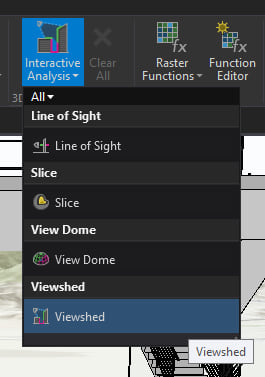 3. Go to Interactive analysis and click on Viewshed. The Viewshed pane opens allowing us to interactively place a viewshed in the view.