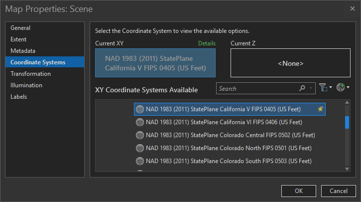 The XY Coordinate Systems available have now been filtered by your area. You can open and explore the Projected Coordinate systems available for the area and choose one. Note that our chosen coordinate system is also present in Projected coordinate system -> State Plane -> NAD 1983 (US Feet) -> NAD 1983 (2011) StatePlane California V FIPS 0405 (US Feet). Click Apply.
