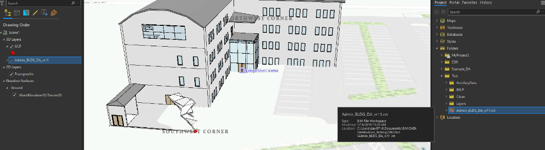 Note: A Revit model may be composed of 5 datasets (Architectural, Electrical Mechanic, Piping and Structural) from Catalog. When you drag and drop a Revit model into ArcGIS Pro, an additional ‘External Shell’ Discipline is added. This is purely a viewing category, which is added by ArcGIS Pro to increase the drawing performance of the scene and not a part of the Revit model itself.