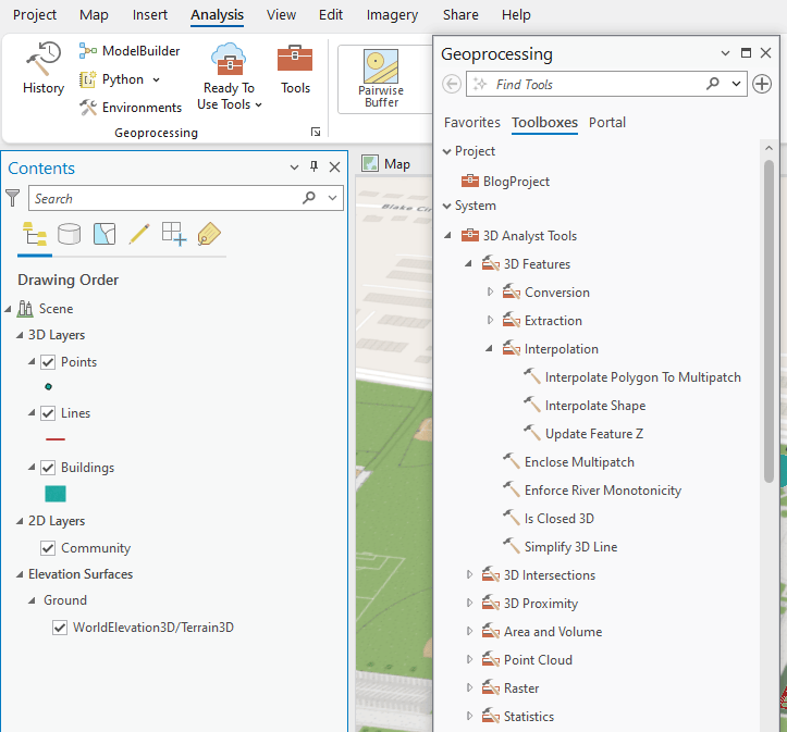 In this blog, I will demonstrate how to properly move 2D features (points, lines, and polygons) into a 3D scene using the Interpolate Shape (3D Analyst) tool and Generalize (Editing) tool. I’ll provide a walk-through of the process with the project I’m currently working on.