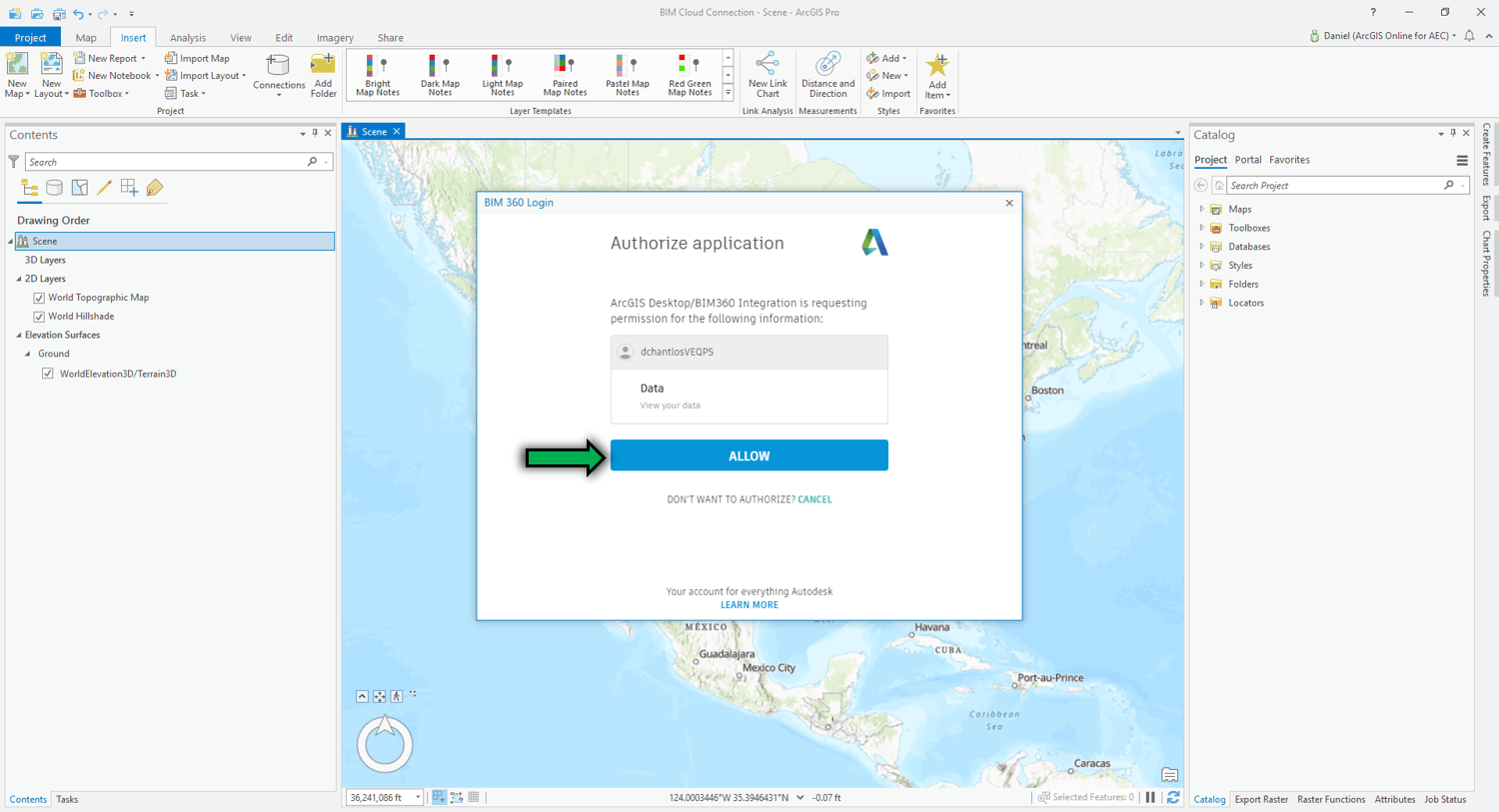 5. Click Allow to authorize ArcGIS Pro to view your BIM360 project data