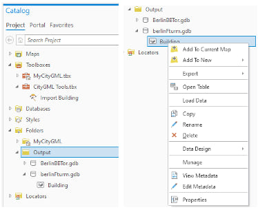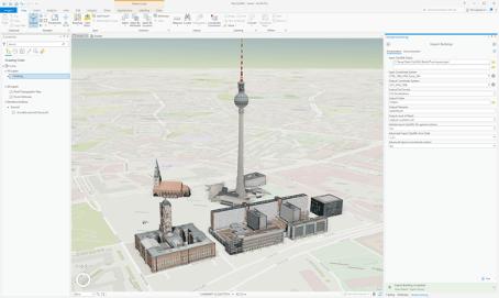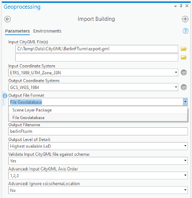 In the list, we have added the geodatabase file option as a new target format to the import dialog. This allows our users to import CityGML data and then edit, analyze, and publish it using the internal scene layer creation tools, to support LOD cache generation for 3D buildings, which the CityGML to I3S workflow is not capable of today.
