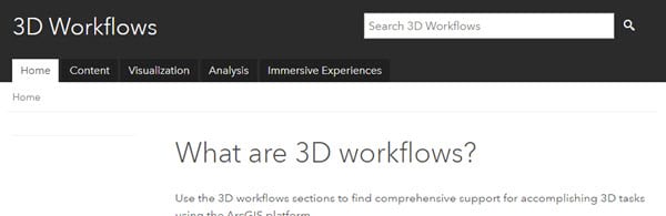 You can use the 3D workflows sections to find comprehensive resources for accomplishing 3D tasks using the ArcGIS platform. Each workflow provides a high-level overview of the for a common 3D problem, then aggregates helpful resources from across Esri to help ensure your success. Each 3D Workflow will include links to videos, blogs, tutorials, best practices, help documentation, community-supported scripts for 3D, and more.
