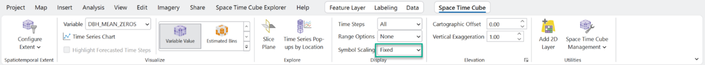 Interact with the ribbon tools to configure your space-time cube layer. You can change visualizing variables, apply different display themes, and configure a temporal extent. To enable the time slider on the web scene, switch Time Steps to Single or Cumulative.