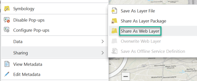 After you finish setting up the visualization, right click on the space-time cube layer in Contents pane. Click Sharing and select Share As Web Layer. Make sure you are signed in to ArcGIS Online or a portal. If you are not signed in, the Share As Web Layer option will not be available.