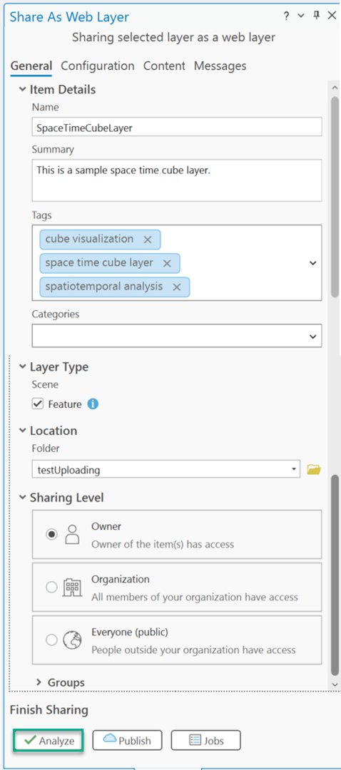 In the Share As Web Layer pane, fill in necessary Item Details, and then set up Location and Sharing level. (You can also edit above information after the layer is uploaded.) Then click Analyze. If there are no errors in the Messages, finish sharing by clicking Publish.