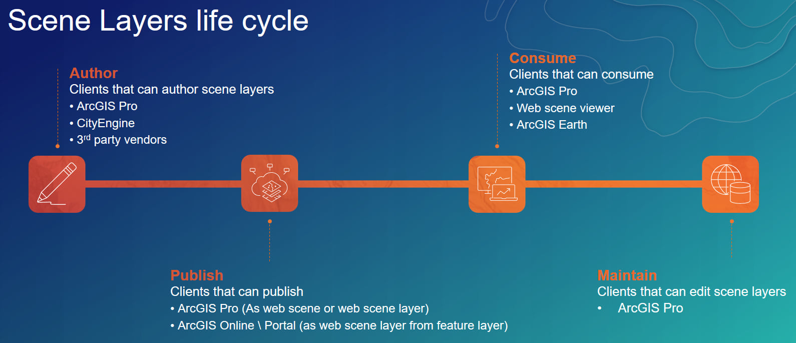 Scene layers are optimized for displaying large amounts of 3D data in a scene. Scene layers are used across the ArcGIS platform in applications like Scene Viewer, ArcGIS Earth, and ArcGIS Pro. A scene layer displays one of four data types: points, point cloud, 3D objects, or an integrated mesh. The scene layer complies with the Indexed 3D Scene layer (I3S) format. The I3S format is an open 3D content delivery format used to disseminate 3D GIS data to mobile, web and desktop clients.