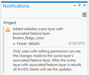 If you are unsure that you can edit a scene layer in ArcGIS Pro you can verify by going to the edit tab > status to view the editing permissions for the layer. See Editing Permissions for more details. You will also see a notification in the notifications pane when an editable scene layer is added.