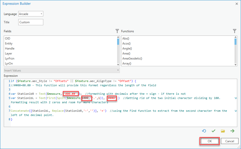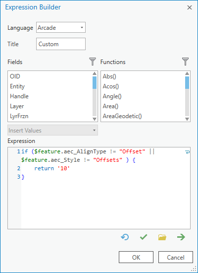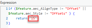 - Arcade code initially checks whether the Type of the alignment is different than Offset and the Style is different than Offsets. These values are read from attributes in the feature class. If the alignment doesn’t have any of those values, apply a number for the interval, in this case, 10, and that is the value that you need to change.
