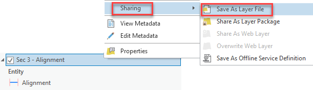 - From the Contents pane, browse to the Alignment feature layer where you changed the symbology definition and right-click and select Sharing > Save As Layer File.