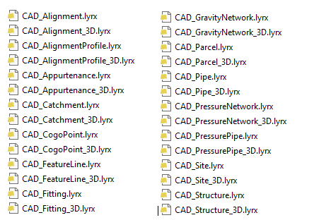 These files are read automatically and applied for each different entity type. The name of the LYRX file dictates which file is used for the matching entity type, where the LYRX file is prepended with the label “CAD_” followed by the name of the Civil 3D entity type.