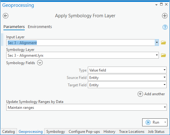 - In the Symbology layer, select the LYRX file that you saved in a previous step, and click Run.