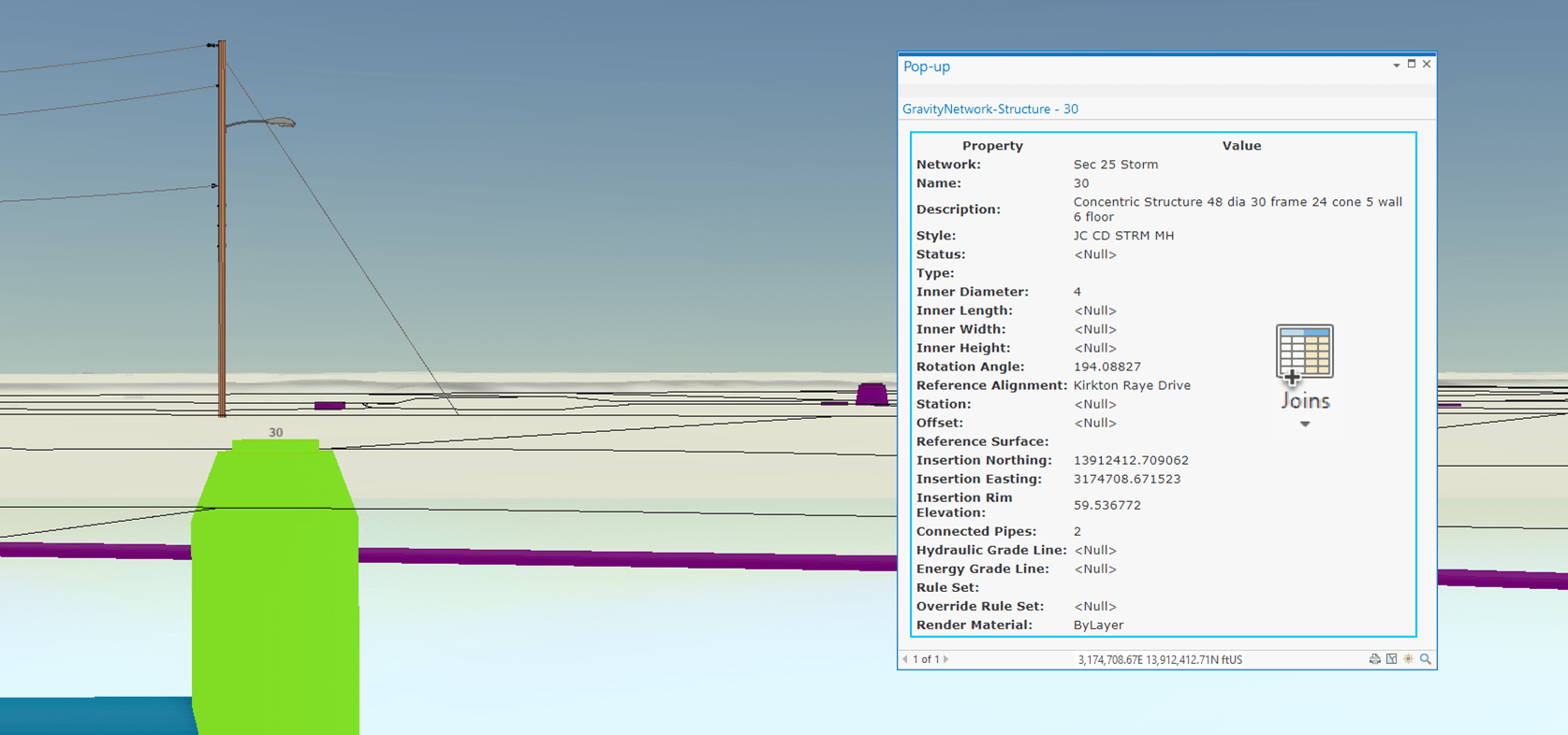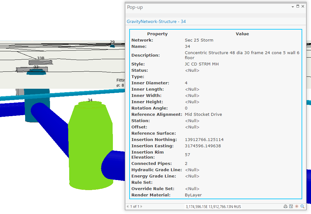 This consolidation of elements and reduced set of attributes is in contrast to the feature classes that represent the individual elements of the networks (pipe, structure, fitting, and so on) as points and lines, because they can be handled as individual feature layers, and each has the full set of AEC attributes that can be displayed alongside the elements. The Multipatch representation is focused mainly on visualization.