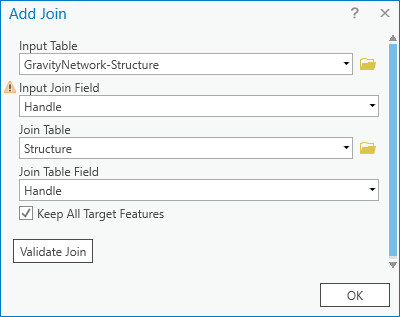 For Input Join Field, select Handle. For Join Table, you can browse to the file location and select Structure, or you can add Structure to the table of contents from the Catalog pane, and it will become available in the drop-down list. After selecting Join Table, the Join Table Field is populated automatically.