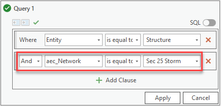 In the new clause, select the Entity attribute; select is equal to as the operator; and from the last drop-down list, select Structure.