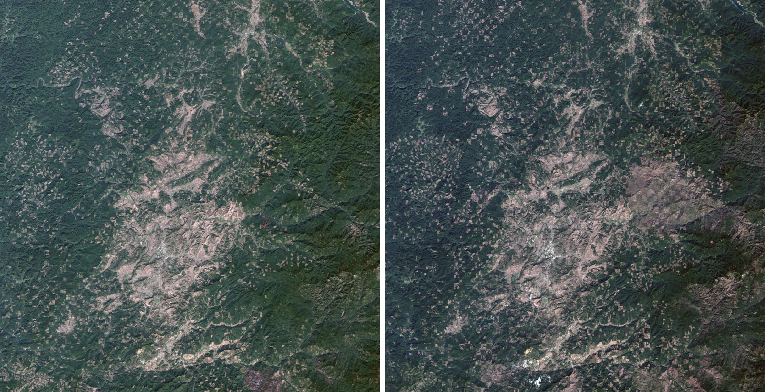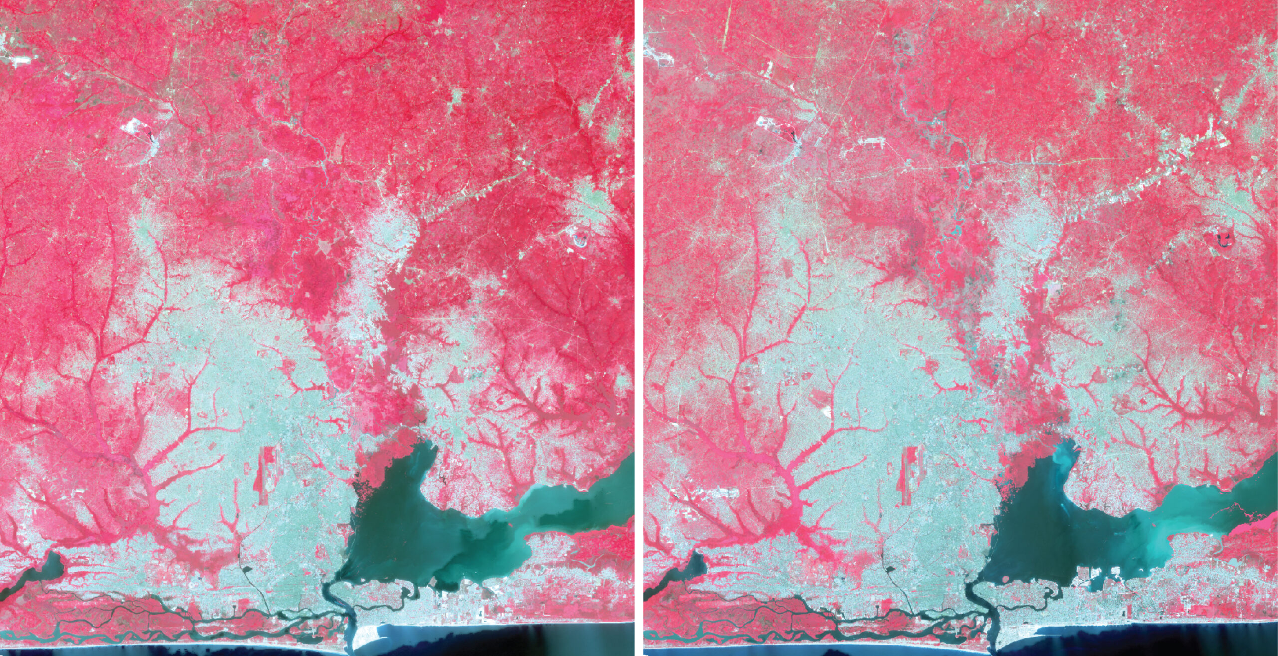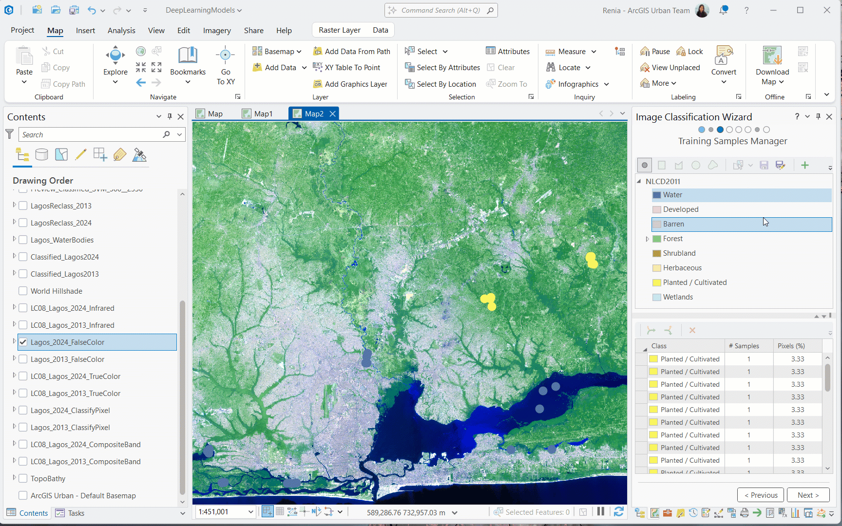 For this workflow, instead of leveraging a Living Atlas deep learning model, I trained my own classification model in ArcGIS Pro. First, I created false color or color infrared composite images for each year, using Landsat 8 imagery from USGS Earth Explorer.