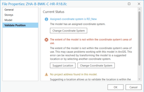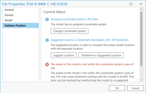 After a few moments, the Validation Position tab updates, informing you that now the model extent is within the coordinate system’s area of use and that the model is at the suggested location.