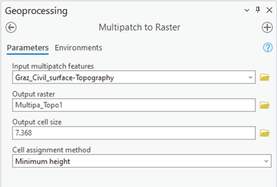 - Browse to the Geoprocessing pane and search for Multipatch to Raster.