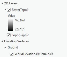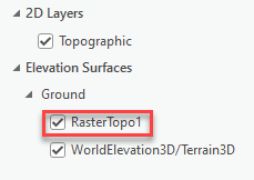 - Browse to the Contents pane, and drag the downward-translated raster layer from the 2D Layers group to the Ground group under Elevation Surfaces, as shown below.