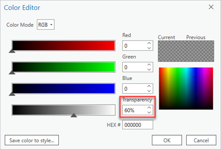 5. In the Color Editor pane, change the Transparency value to the desired level (for example, 60%) and click OK.