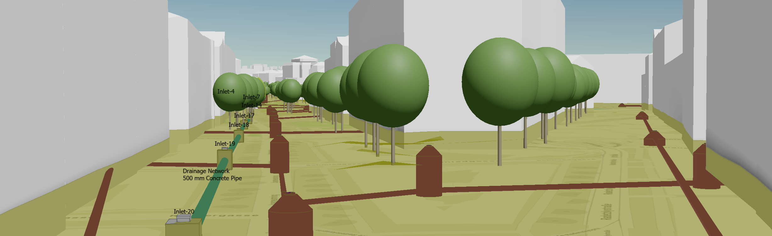 In this way, the existing ground, proposed ground, and the built components located beneath the proposed ground surface are all included in the scene for visualization.