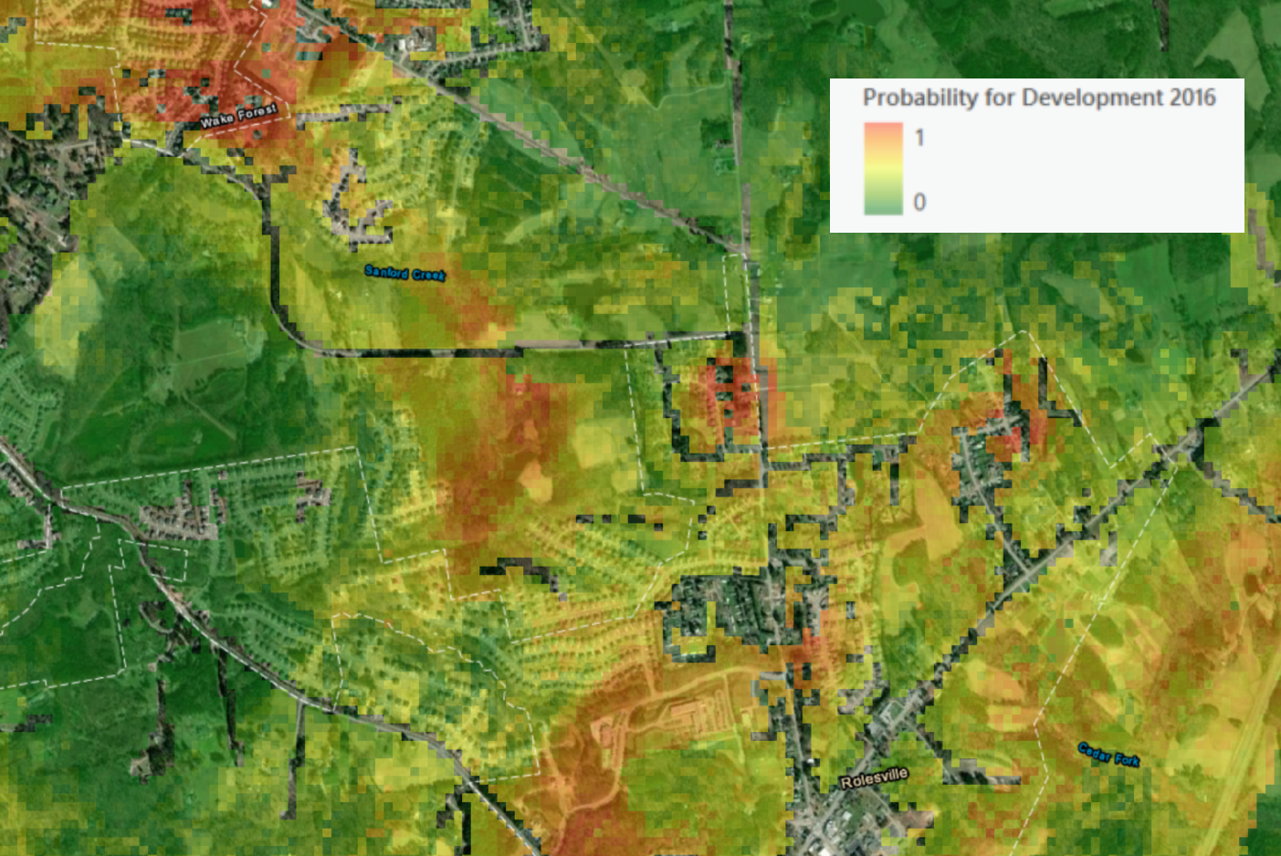 Once the predictions were modeled, the resulting dataframe, which included the predicted probabilities for an urban area to be developed, needed to be transferred back to ArcGIS Pro for visualizations. In RStudio, arc.write() was used to write the data frame from R to the original geodatabase in ArcGIS. The resulting table in ArcGIS included columns containing the prediction results from the Random Forest model, including the predicted probability for each record to change from non-urban to urban. The ArcGIS Pro table imported from R was then joined to the original point feature class using the ‘Add Join’ tool, then a raster layer was created based on the joined point feature using the ‘Point to Raster’ tool.