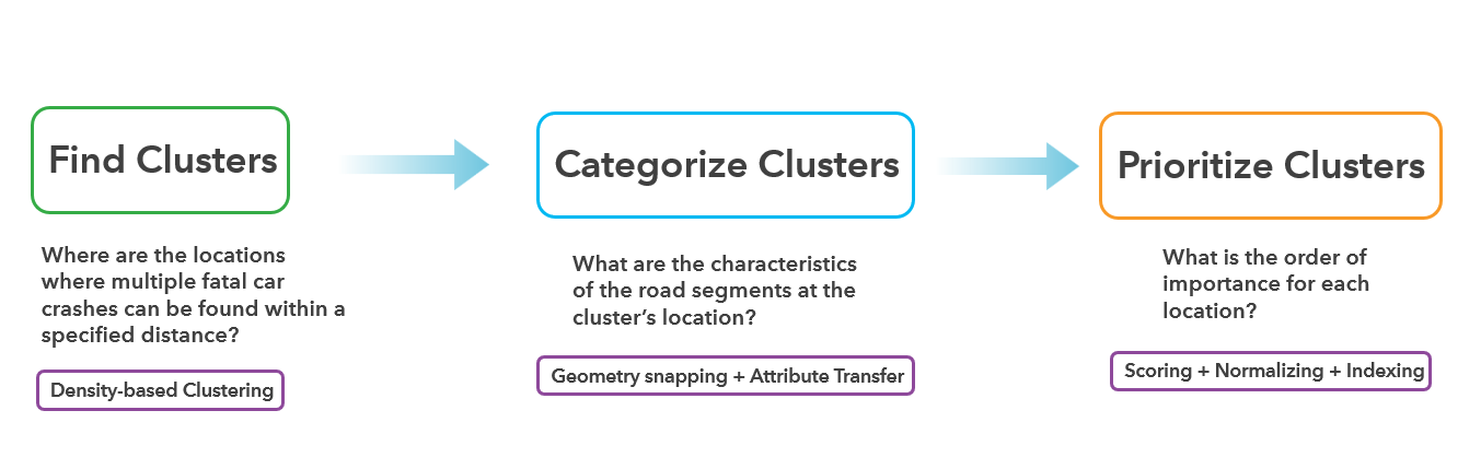 In our analysis, we identified these important locations using Density-based Clustering, an approach that identifies clusters based on the concentration of accidents in space. For this example, we used a simple definition of what a cluster means (300 meters; three accidents minimum per cluster), but the tool is also able to discern the meaning of a cluster from the provided data.
