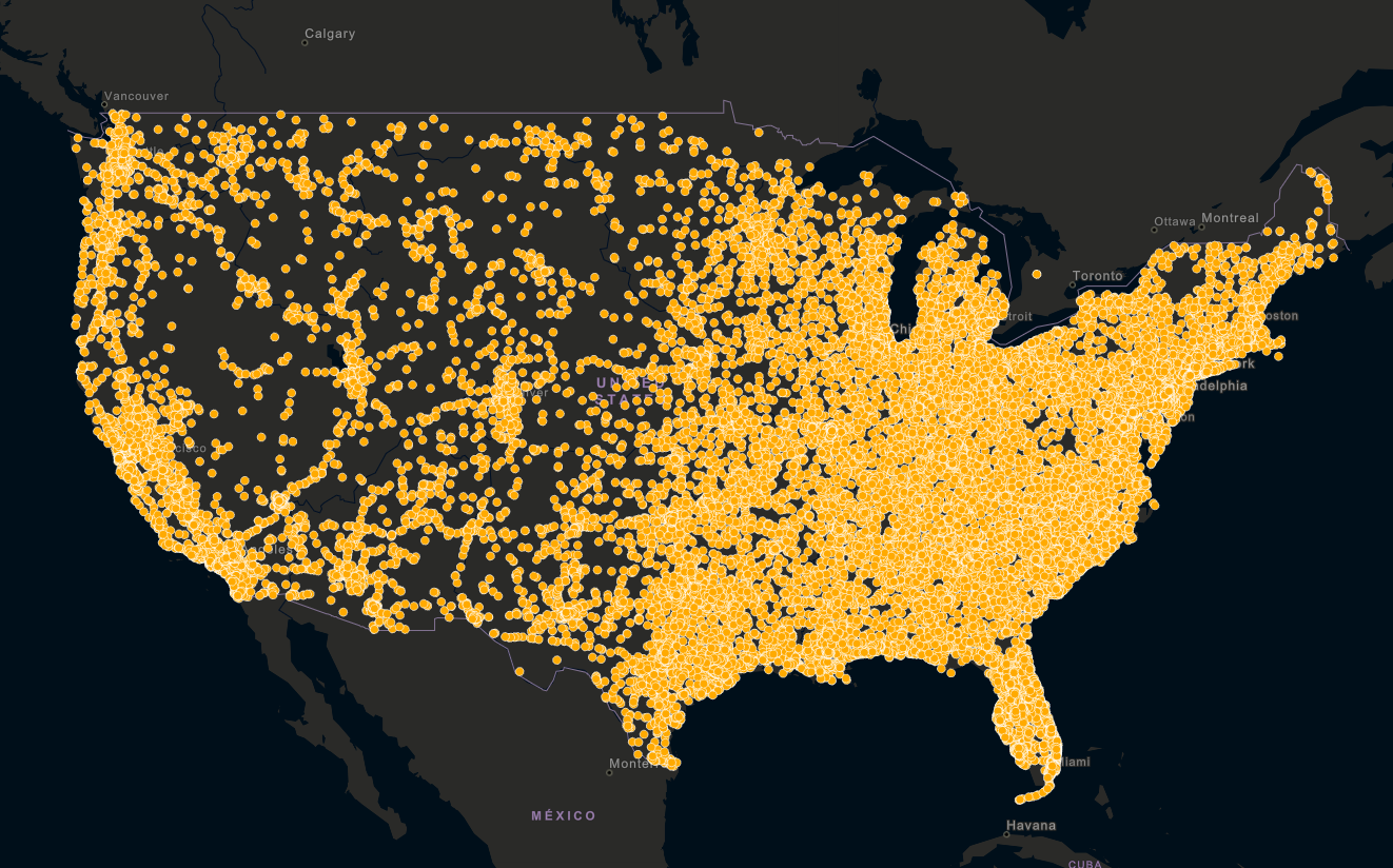 Consider the following map, where nearly 35,000 fatal car accidents in the United States in 2016 have been distilled down to 60 specific locations to focus on based on the density of clusters of fatal crashes: