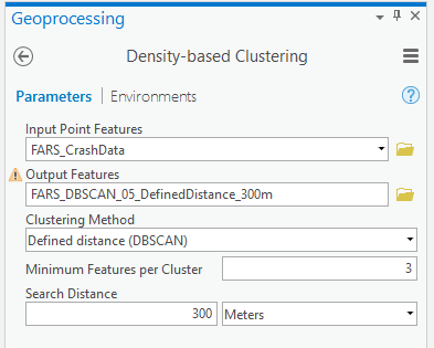 Since our data contains discrete fatal accidents across a full year, the answer to this question would be a useful first step to help us find road segments and intersections where a systemic safety problem may be at fault. With the Density-based Clustering tool applied to NHTSA’s Fatality Analysis Reporting System (FARS) data, finding this answer is a single step in ArcGIS.