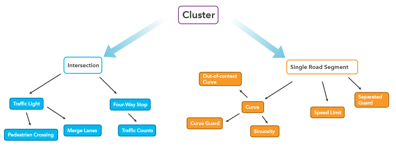 - The elements of the transportation network at the cluster’s location, such as the presence of an intersection or the posted speed limit, become basis for classifying the clusters into groups that can be addressed by common safety measures. An example group would be “Intersection and Traffic Light Clusters”.