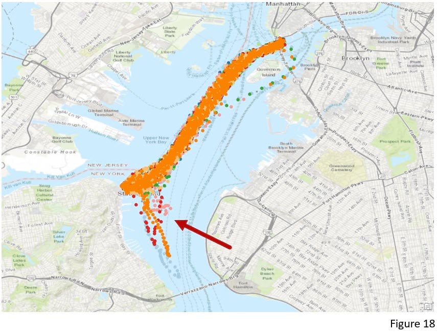 Since OPTICS is able to detect clusters with different densities, it can also be used to identify the movement of objects even if they are traveling at different speeds. Figure 17 is a ferry route dataset where each point was collected every 5 minutes. Without knowing which points belong to the same vessel, using OPTICS with a 5-minute Search Time Interval, this tool captures the path of vessels with normal and abnormal routes correctly identified (Figure 18).