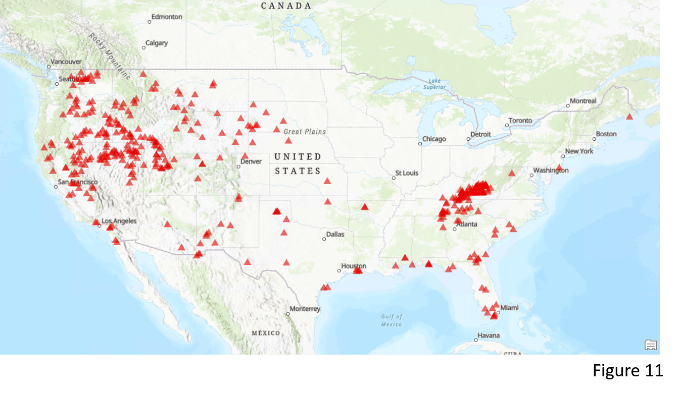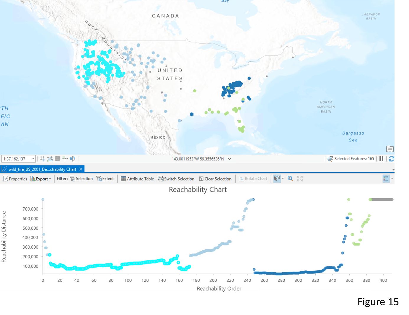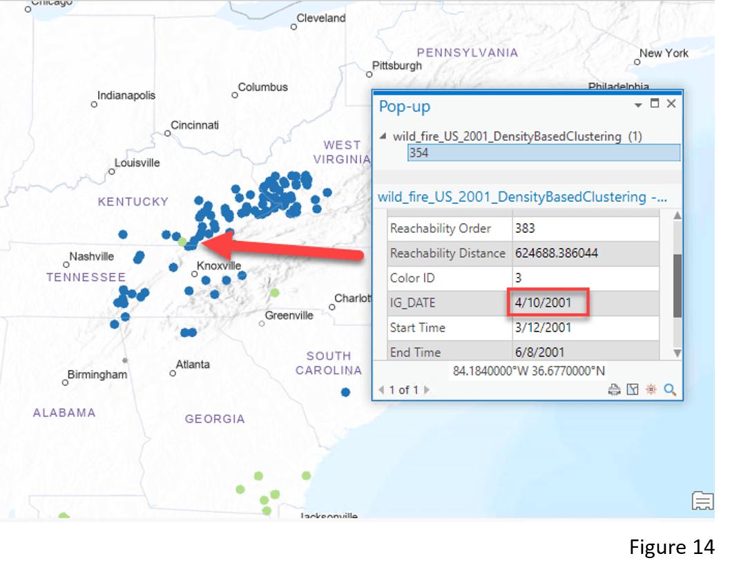 Looking closer at the Appalachian Mountain area (Figure 14), you might notice some points belonging to Cluster 3 (green color) appear to be in Cluster 2 (dark blue color). This is because the enhanced tool takes into account the temporal aspect of the wildfire incidents. For example, wildfire incident #354 is identified as a member of Cluster 3 (green color) but not Cluster 2 (dark blue color) because it happened in spring (April 10th ) but not fall or winter.