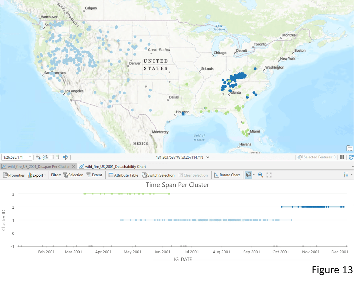 The tool identifies 3 spatial-temporal wildfire clusters that are different in densities (Figure 13). Cluster 1 (light blue) in the West region has the lowest density and Cluster 2 (dark blue) in the East part has the highest density. The Time Span Per Cluster chart also tells us the temporal characteristics of these three clusters. Wildfire incidents in the West (light blue) happen frequently from mid-April to mid-October. Whereas most wildfire incidents surrounding the Appalachian Mountains happen during fall and winter.
