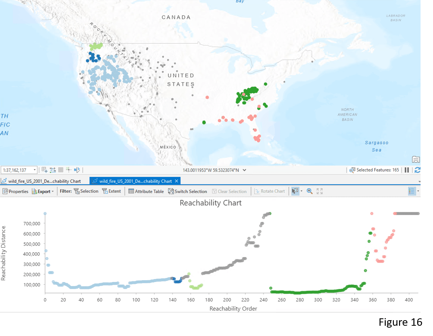 We can also use the Reachability Chart to dynamically explore details of the clusters. When selecting the low-valley points of Cluster 1 (light blue) in the Reachability Chart, those points that are most dense in the cluster are interactively shown on the map (Figure 15). Another way to further identify details in the clusters is by adjusting the Sensitivity value. In Figure 16, the original Cluster 1 is now divided into three denser clusters after I increased the Sensitivity value. Please refer to the documentation for more details about reachability distance and sensitivity.