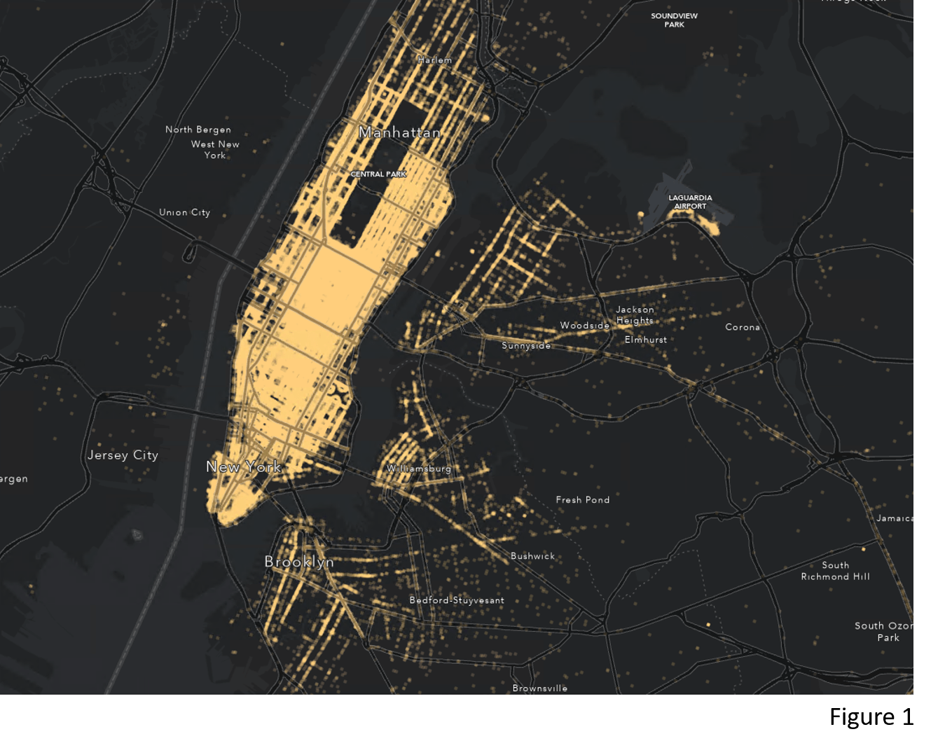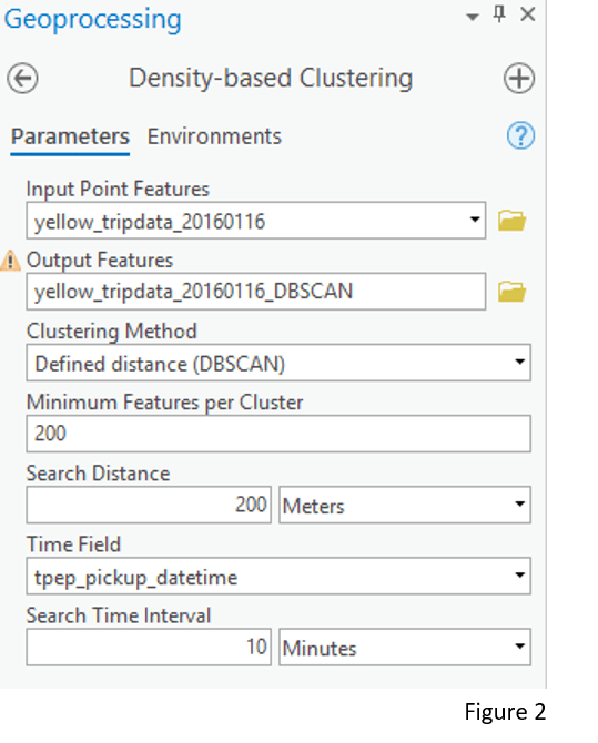 Identifying spatial-temporal clusters of taxi pick-up points can be useful in traffic management planning or connecting drivers with potential customers. Figure 1 shows the yellow cab taxi pick-up points in New York City on Saturday, Jan 16th, 2016 and it is very unlikely that one can identify the spatial-temporal concentration of demand by looking at the map. The enhanced Density-based Clustering tool serves as a powerful tool for this problem.