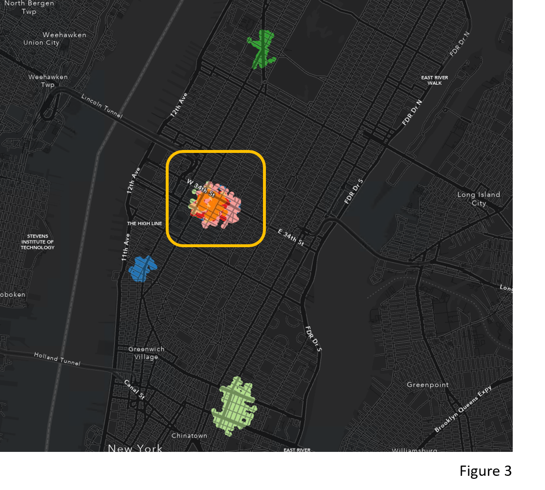The tool generates clusters of points and noise. Figure 3 is the clustering result after excluding noise points. You might notice that there are many overlaying clusters (The clusters in the yellow box). Let’s zoom in to those clusters (Figure 4). These clusters are located around the Madison Square Garden, which sits above one of the main railroad stations in New York City (Pennsylvania Station). This could indicate that many people come into the city by train and then continue the travel to other places by taxi. Also, the various colors in Figure 4 tell us that there are multiple taxi pick-up clusters at different times of the day. This temporal detail is available because the tool incorporates time attributes using the provided Time Field and Search Time Interval. Taking time into account is important for taxi pick-up data. It differentiates when taking a taxi is in great demand around the Madison Square Garden, which is not able to be achieved if we used Density-based Clustering without time.