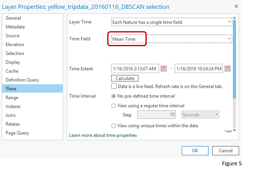 In ArcGIS Pro 2.8, we provide three ways for you to explore these spatial-temporal clusters. First, the tool returns the Start Time, End Time, and Mean Time of each cluster in the attribute table. Therefore, we can set the output layer to be time–enabled by choosing the Mean Time as the time field (Figure 5).