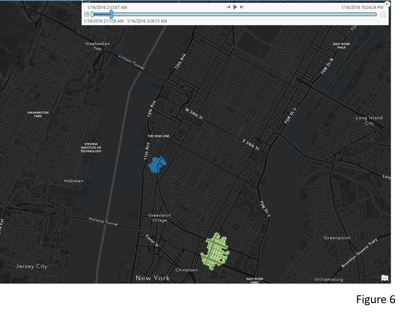 After the output layer becomes time–enabled, a Time Slider should appear at the top of the map (Figure 6). Then we can click play to see the clusters popping up at different times.