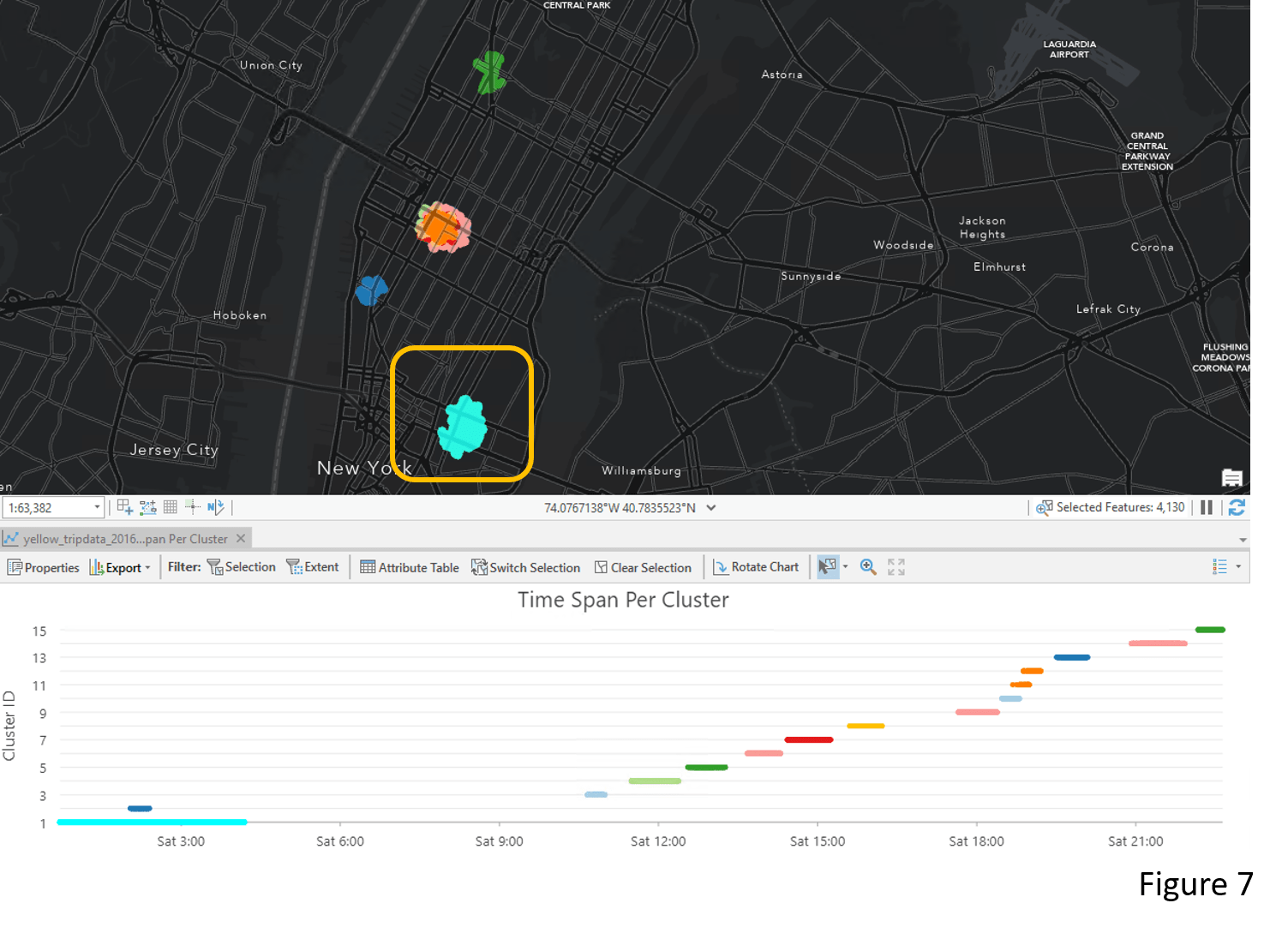 The Time Span per Cluster chart that comes with the output layer is another way to explore the clustering result. Each line in the chart represents a cluster from its start time to its end time. For example, there is a taxi pick–up cluster near the Lower-East Side between midnight and 4 AM (Figure 7). In Figure 8, by selecting clusters around Madison Square Garden, we see clusters start to appear around 11 AM and end around 10 PM. This means people frequently take a taxi during this period. However, there is a noticeable gap between 4 PM to 5 PM that needs more investigation.