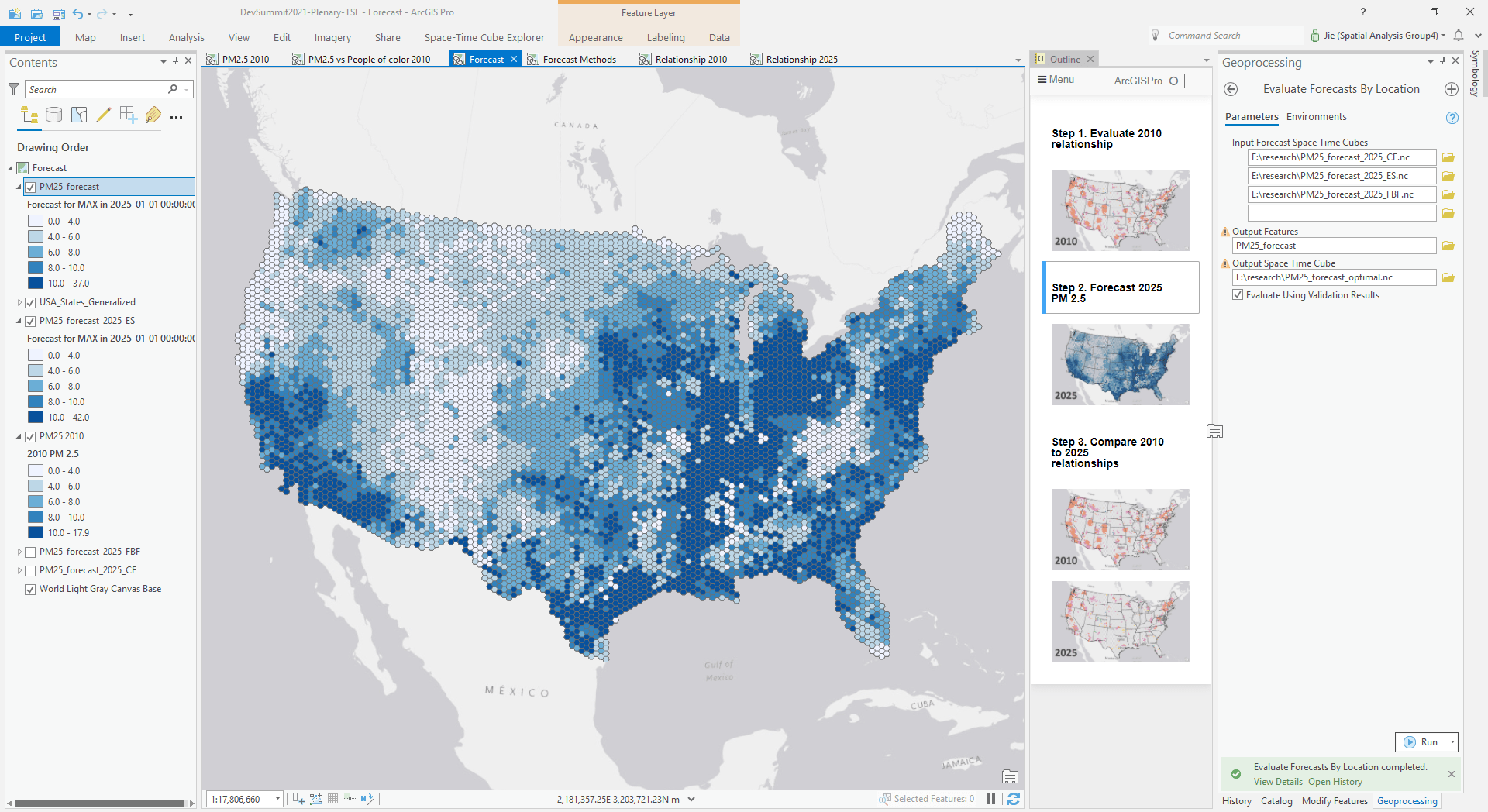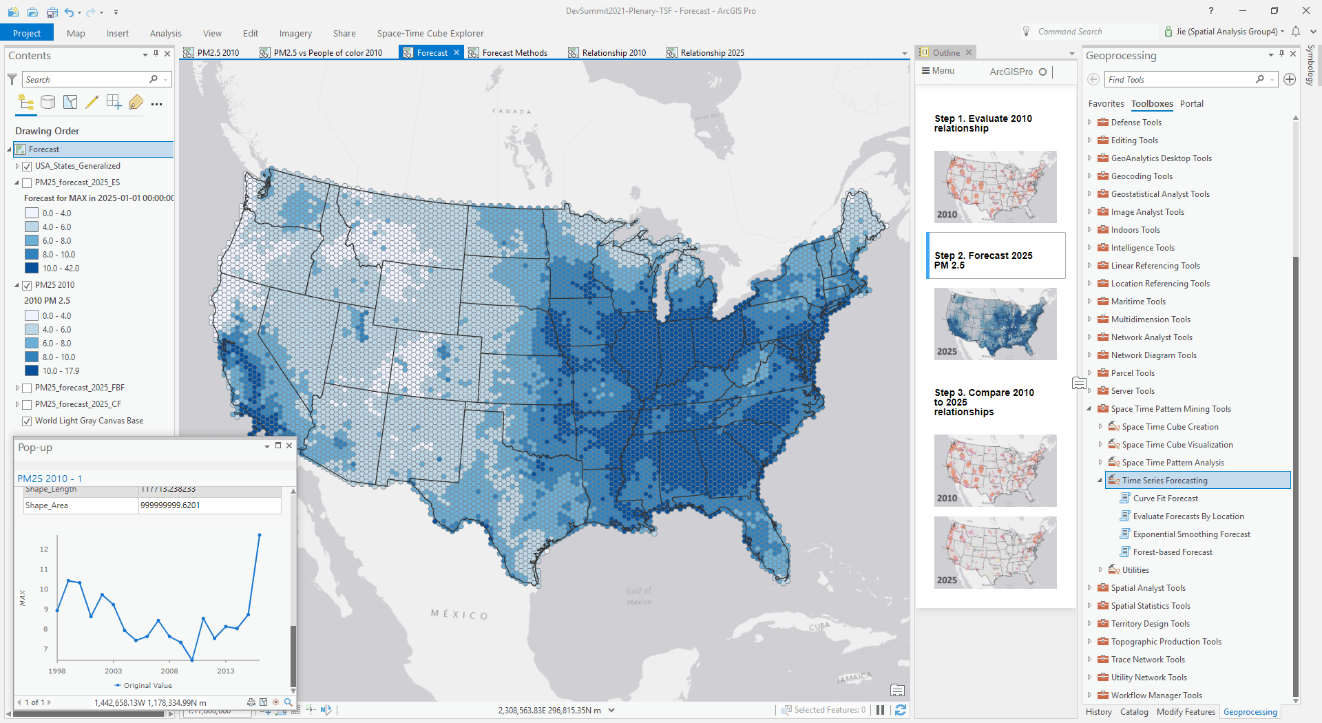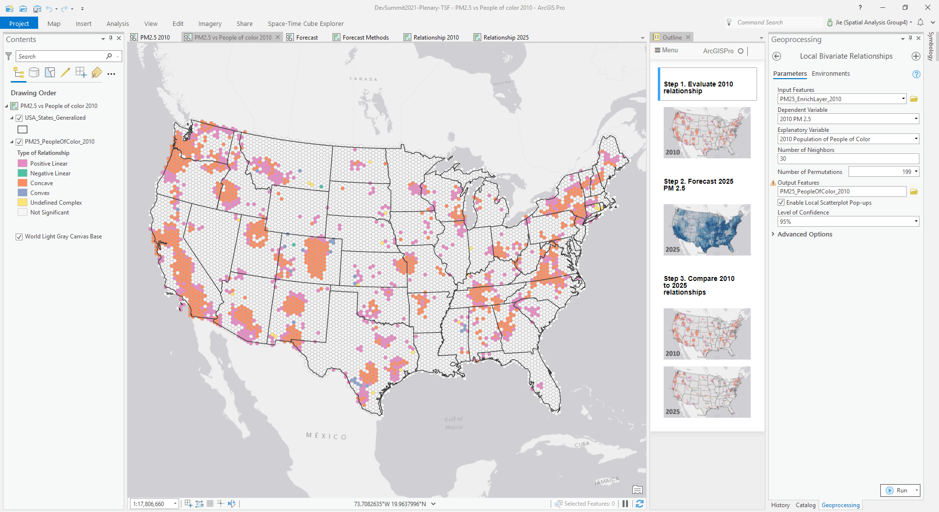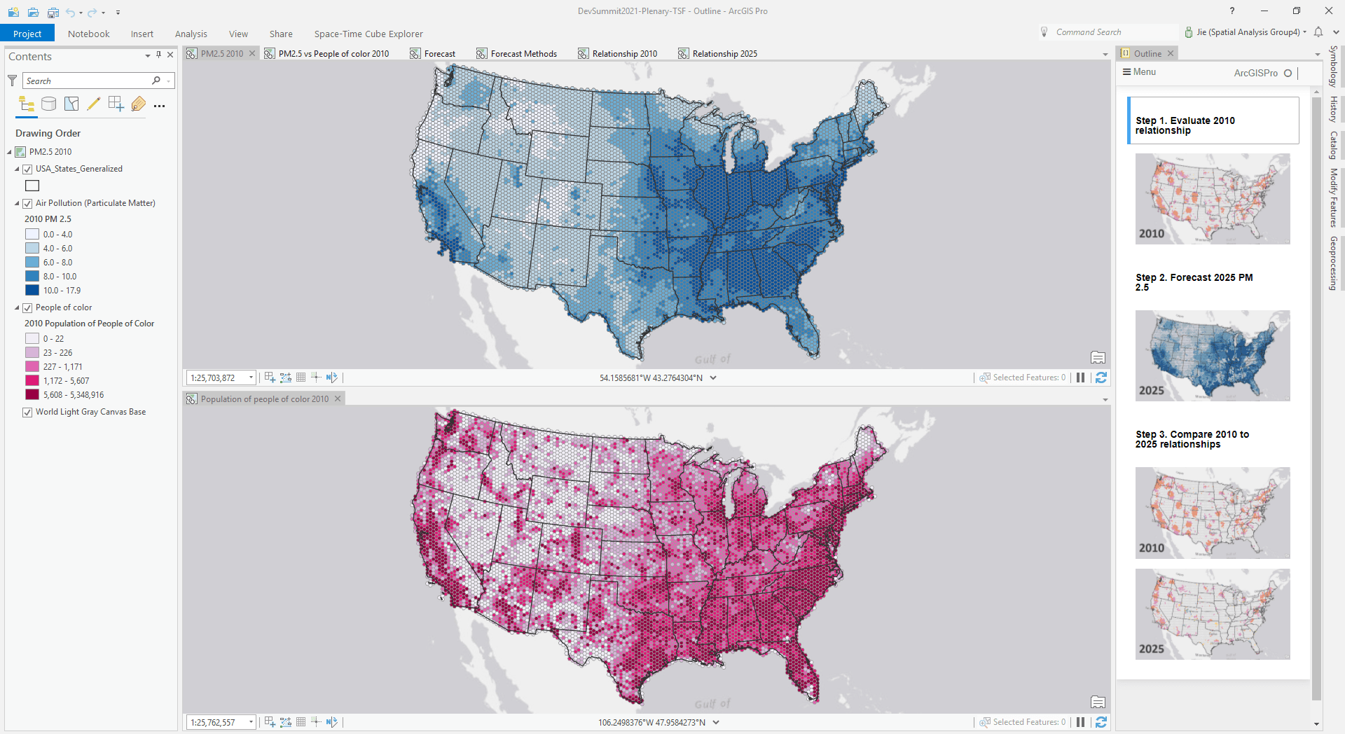 The first goal of our analysis is to find where the relationship between air pollution and the pis strongest. Then, we’ll explore what the future might look like by forecasting our PM 2.5 data to 2025. Finally, we’ll see how the relationship between air pollution and the population of people of color might change in the future. This will help us prioritize action. To do this, we’ll expand on our initial visualization and analysis using machine learning tools in ArcGIS Pro.