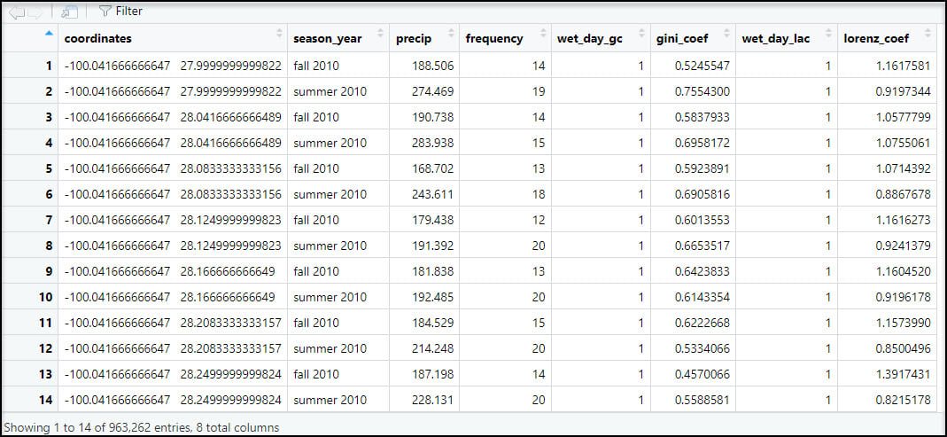We’ll then join these three separate data frames together using the merge function two times in a row. First, we join the Gini and Lorenz data frames together, then we join that result to the data frame containing the aggregated total precipitation and precipitation days attributes. Note that in both of these joins, the common attribute (key field) is actually a combination of the “coordinates” and “season_year” columns, because there are precipitation variables for two seasons for each location.