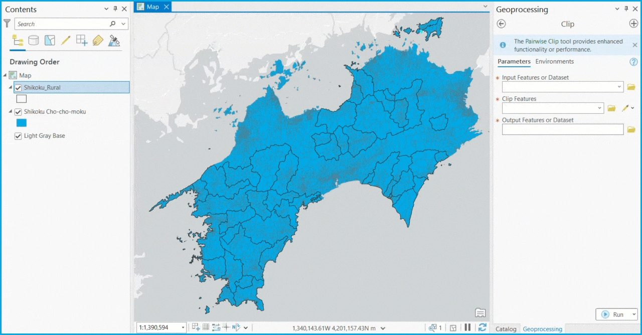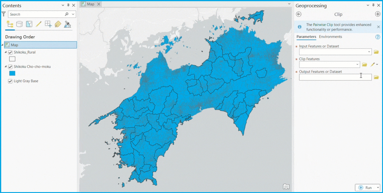 We are attempting to Clip the administrative regions (i.e., Cho-cho-moku) by rural areas to determine the portion of each administrative region that is rural. Unfortunately, the output does not display immediately on the map as expected.