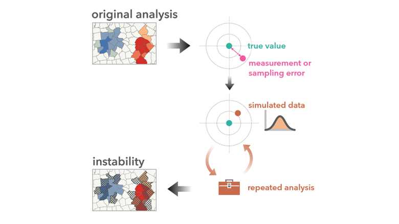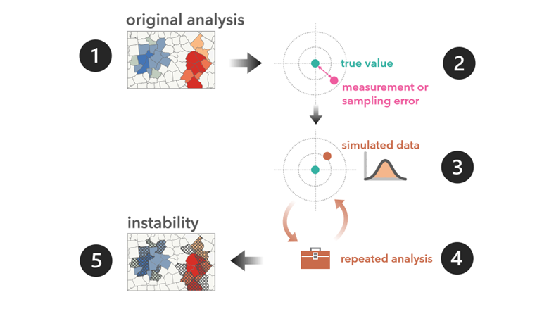 #5: After several repetitions, the results are collected and summarized. Any location that differs substantially from the original analysis is deemed “unstable.”