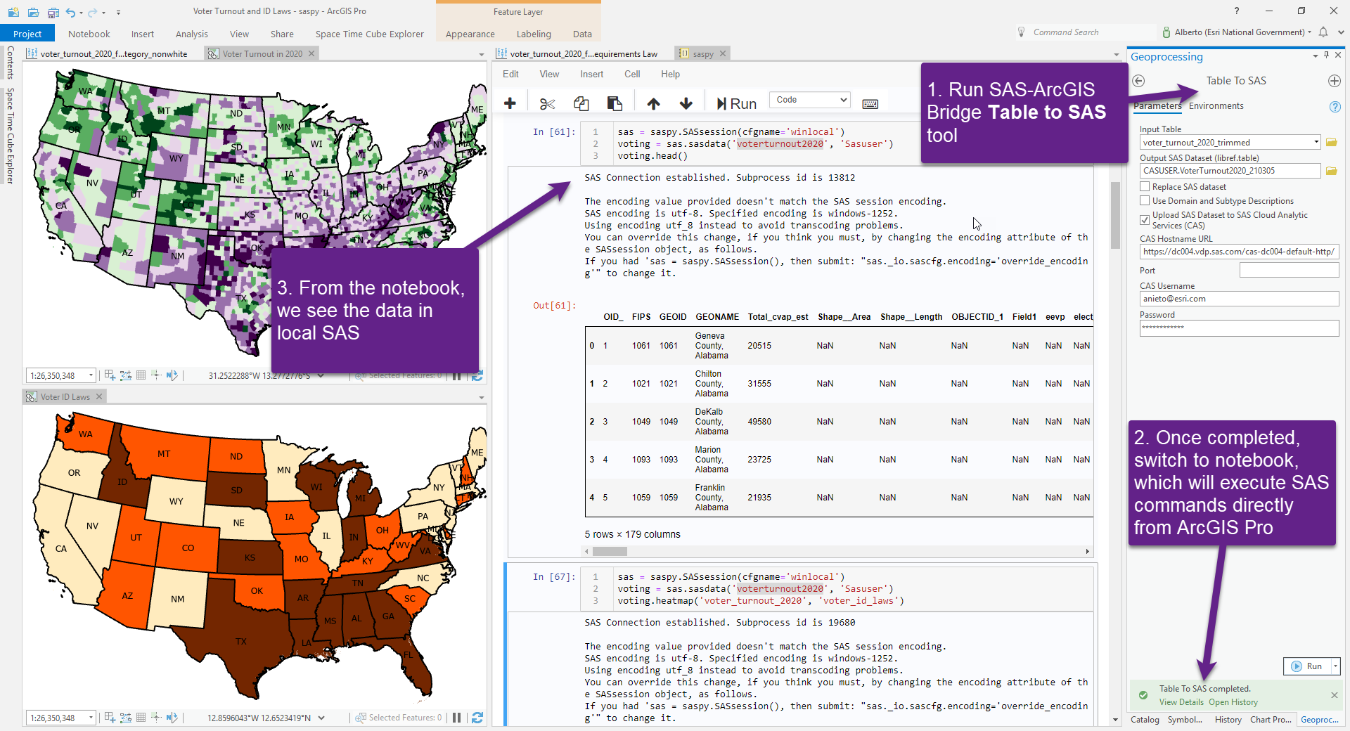 - Once completed, open a notebook inside ArcGIS Pro. Import the SASPy module (SAS® desktop) or SWAT module (SAS Cloud Analytical Services) and load the table:
