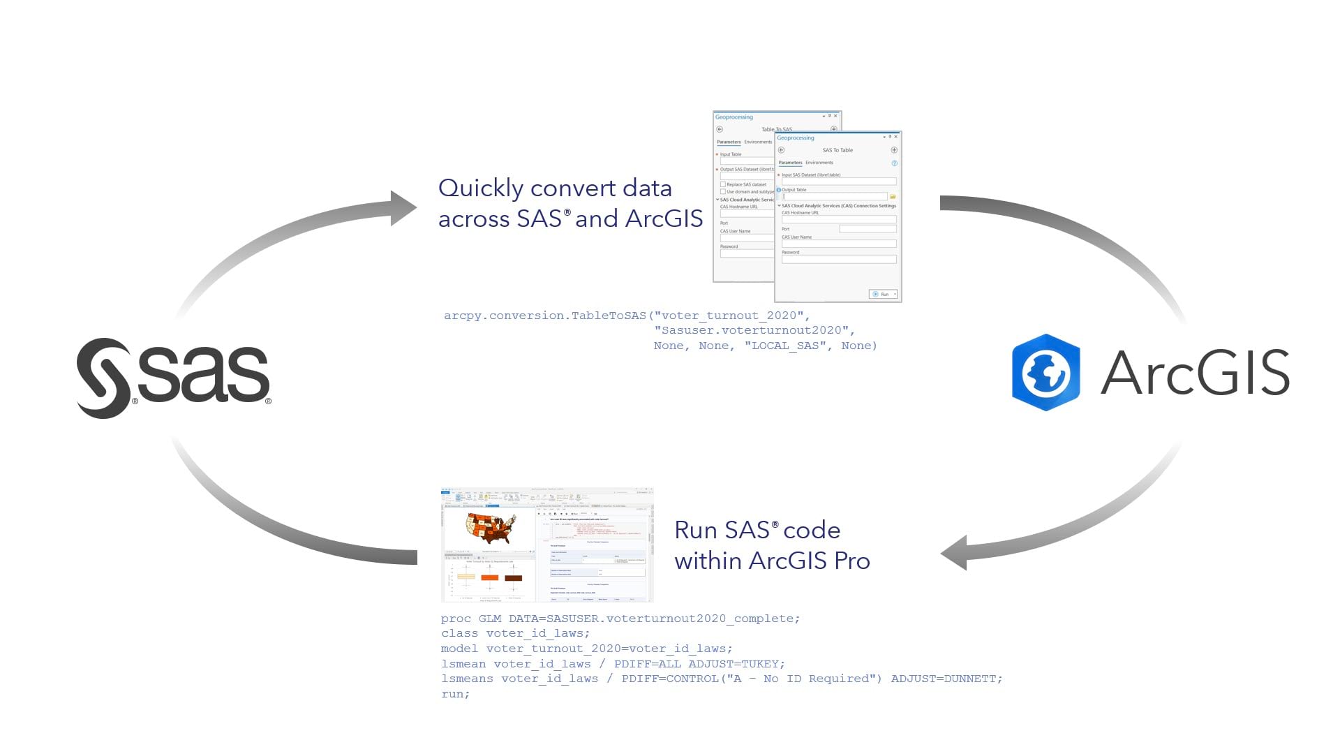 The SAS®-ArcGIS Bridge also allows you to use SAS analysis procedures directly within ArcGIS Pro.