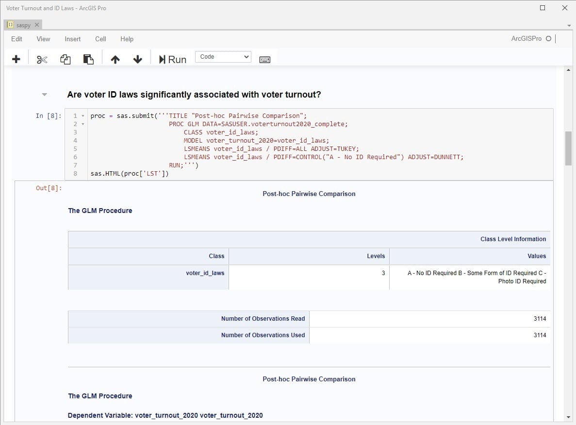 The goal of this exercise will be to assess whether the change in voter ID laws for each state has a statistically significant effect on voter turnout. While we are used to assessing variable relationships between variables in ArcGIS Pro, it becomes more challenging when we work with categories. For this reason, we will use the SAS®-ArcGIS Bridge to export the data to SAS and run a basic procedure to assess this relationship.