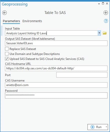Table To SAS accepts any feature layer with an attribute table and converts it to a format that can be used in the SAS software suite. A few additional parameters allow you to designate whether you want to overwrite an existing SAS dataset, leverage any domain and subtype descriptions, and optionally connect to SAS CAS to upload your dataset to the SAS Cloud.