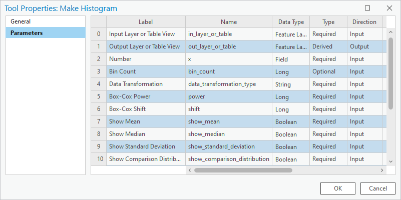 To help illustrate the process of creating a chart tool, I’ve created basic sample tools that you can download here. These sample tools implement a geoprocessing tool interface for creating and configuring charts, but you can imagine following a similar procedure for outputting charts in a variety of other contexts. As the examples show, building tools that output charts is a straightforward process if you have experience with ArcPy and creating script tools in Pro. The main task involves creating geoprocessing tool parameters that allow you to set properties of a chart class within the arcpy.charts module. For instance, here is the code that creates the x and bin_count parameters for a histogram:
